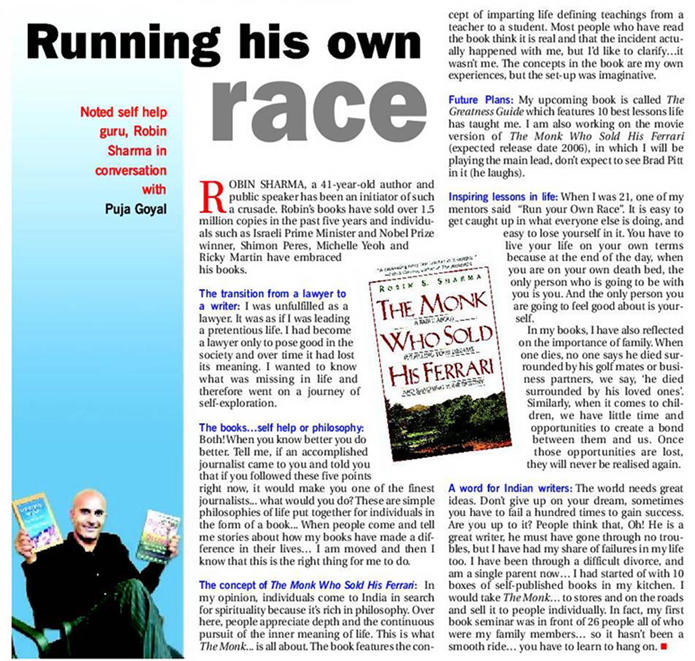 Future Plans: My upcoming book is called The Greatness Guide which features ten best lessons life has taught me. I am also working on the movie version of The Monk who sold his Ferrari (expected release date 2006), in which I will be playing the main lead, don’t expect to see Brad Pitt in it (he laughs).